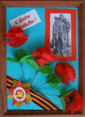 Открытка-коллаж: цветной картон, ч/б фото, георгиевская лента, искусственные цветы. Внутри открытки праздничное поздравление.