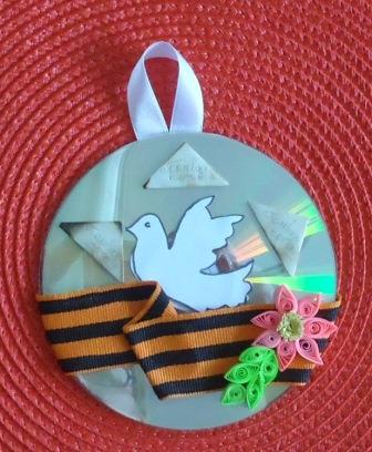 Работа сделана на диске — это коллаж: георгиевская лента, картон, ленточка атласная, цветная бумага (квиллинг).