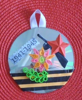 Коллаж на диске: цветная бумага для георгиевской ленты и для квиллинга (цветы), цветной картон.