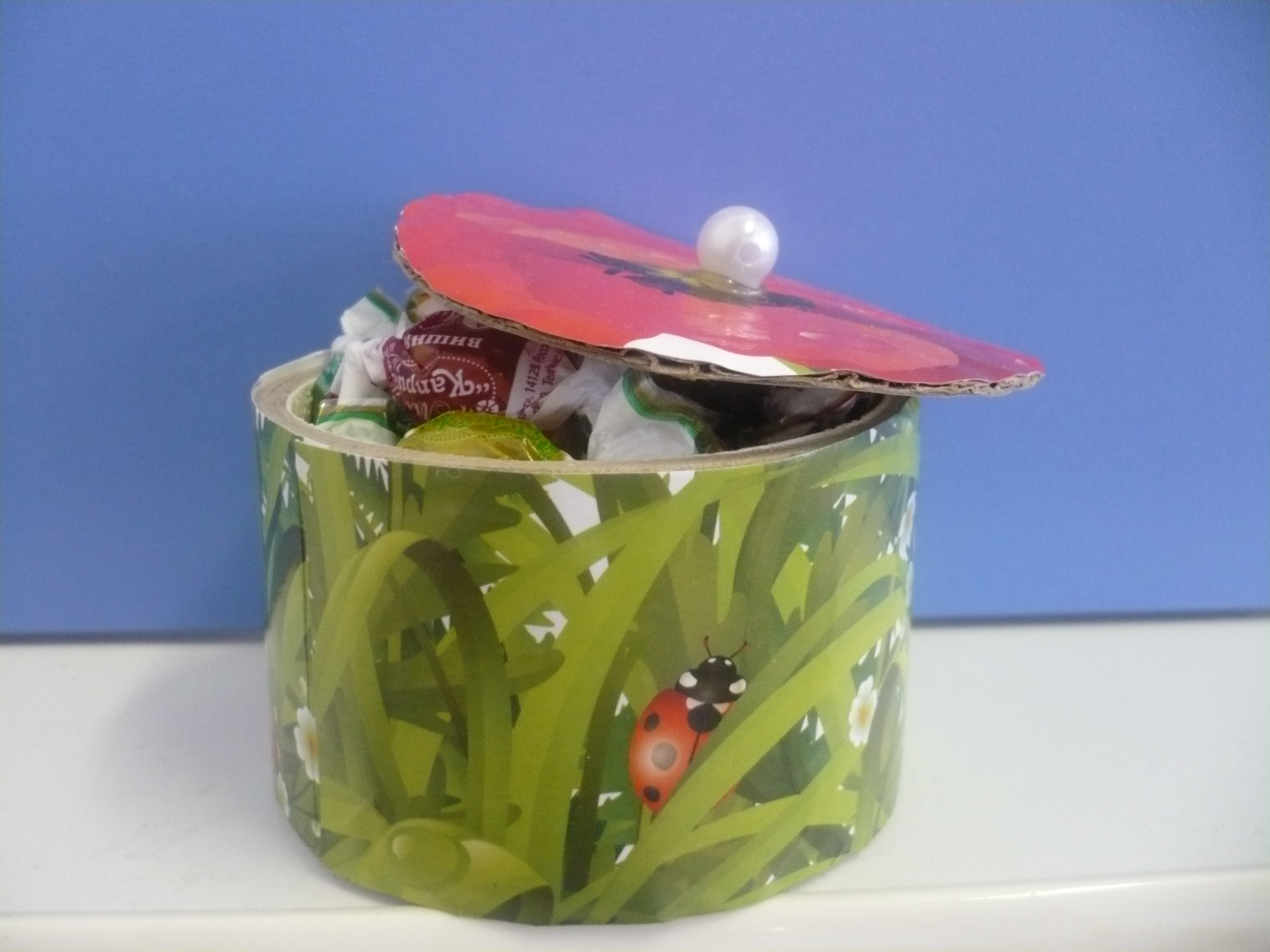 Шкатулка выполнена из картона от скотча, обклеена вырезками из журнала.