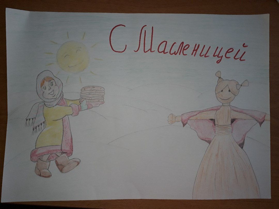 Максим, твой рисунок очень забавный, особенно улыбающееся солнышко. Наверное, вместе с Масленицей оно радуется угощению.