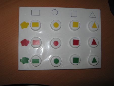 Вариант 2: Пробки хаотично вкручены на поле. Ребёнку даётся задание запомнить расположение пробок, а затем пробки откручиваются и ребёнок приступает к восстановлению ранее расставленных пробок (возраст 5-8 лет).