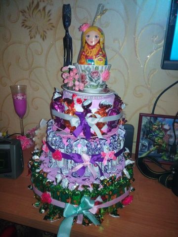 Вкусный торт из бумаги и конфет, отличный подарок на любой праздник.