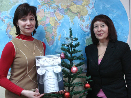 На фото: Е.А. Волынчикова (слева) получила сертификат от директора ТА « Вольный ветер » Г.Н. Часовниковой