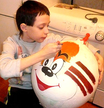 2. Покрыли корпус тигра водоэмульсионной краской для того, чтобы последующие слои краски ложились ровно и красиво. Когда водоэмульсионка просохнет, нанесли рисунок мордочки карандашом, и приступили к раскрашиванию красками.