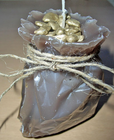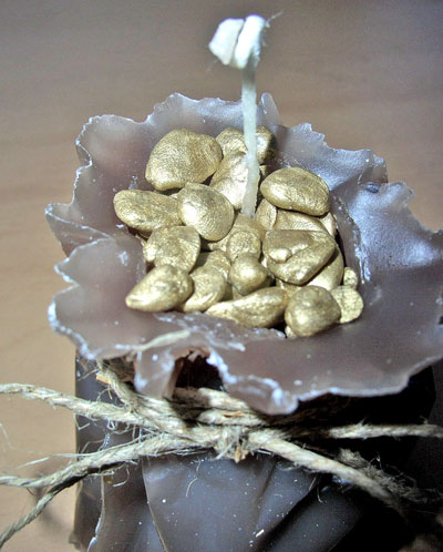 8. Из золотой восковой фольги слепить шарики разного размера, насыпать их в центр свечи, завязать веревочку.