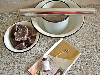 1. Нам понадобится: свечная масса (она у меня уже покрашена восковым мелком в коричневый цвет), посуда для паровой бани, пищевая фольга, фитиль с грузиком на одном конце (у меня гайка), восковая золотая фольга, ароматизатор.