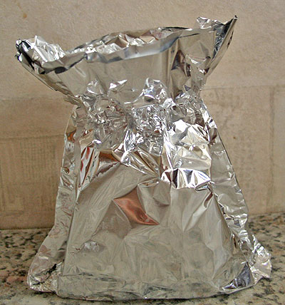 2. Свернуть из фольги пакетик, лучше сделать её в два слоя для прочности. Сформировать пакетик в мешочек.