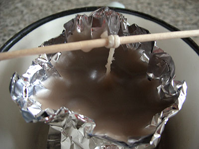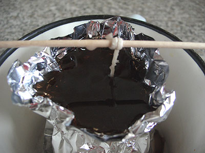 4. Соорудить из подручных средств крепление для фитиля и залить воск в форму.