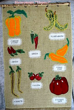 Предупреждаю, что работа эта очень скрупулёзная, требующая огромного терпения и старания, так как элементы перцев, особенно листочки, очень мелкие. Название перцев вручную выстрочено на машинке по трафаретам.