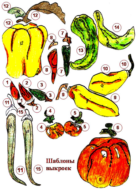 1. Изделия (перцы и листочки) кроим по выкройкам, которые приведены ниже на одном из рисунков (припуски на швы не нужны). На выкройках нанесены линии, которые придают объемность. Эти лини необходимо перенести на выкройку: при помощи цыганской иголки делаем проколы примерно через 5-10 мм. Кусочки ткани перед раскроем необходимо проклеить флизелином – края меньше обсыпаются и растягиваются. Из бязи нарезаем прямоугольники, флизелином не проклеиваем, а делаем по краям бахрому примерно на 5-7 мм (выдергиваем нити утка и основы). На лицевую сторону выкроенных перцев наносим рисунок, в виде точек, карандашом со стержнем через отверстия, проколотые цыганской иглой.