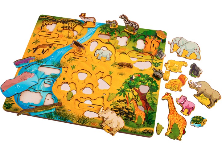 Дерево – очень фактурный материал, и взаимодействие с ним положительным образом сказывается на развитии мелкой моторики. Для усиления этого эффекта фигурки в таких пазлах зачастую снабжают маленькой кнопочкой-ручкой. Когда малыш берется за нее, происходит стимуляция нервных окончаний на подушечках его пальцев.
