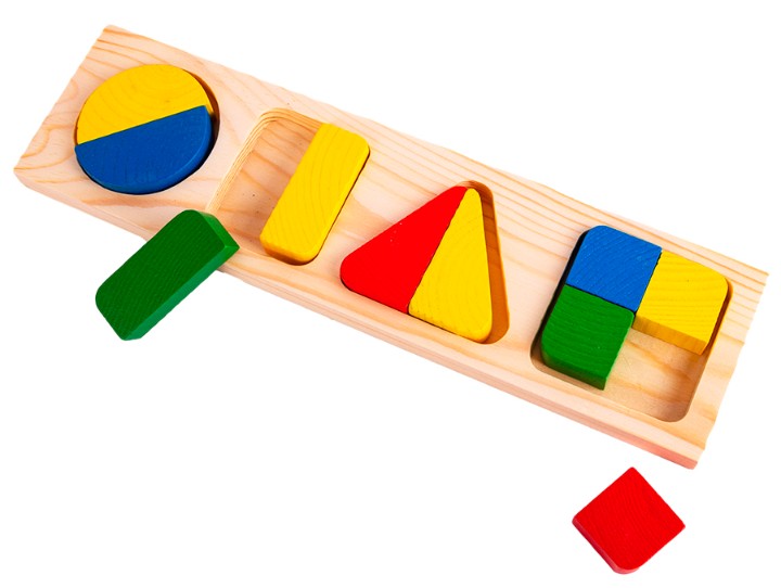 Для деток постарше, в 2-3 года, подойдут варианты посложнее. Например, такие, где геометрические фигуры разделены на несколько частей и ребёнку нужно собрать в углублении досочки целую детальку. Это отличный вариант занятия, чтобы объяснить малышу, что такое "целое" и что такое "часть".