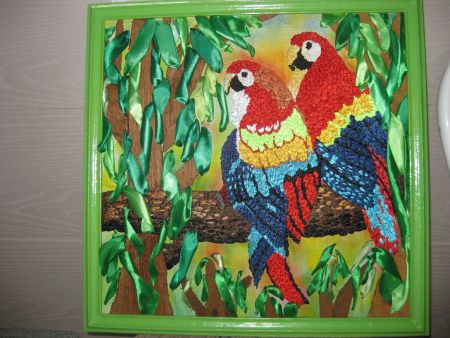 Потрясающие попугаи! Не верится, что они вышиты не нитками, а лентами. Подробно расписан процесс изготовления работы. Картина оформлена в раму и имеет завершенный вид. Единственное, на мой взгляд ветви дерева с листочками немного выбиваются из технологии. Я так понимаю именно они и выполнены как аппликация? Удачи в конкурсе!
