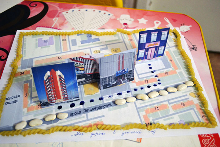 Наша Аня любит рисовать и что-то мастерить. В детском саду проходили тему по развитию речи: «Здания нашего города (Новый Уренгой)». Сделали интересную работу: распечатали карту нашего района, картинки зданий (дома, торговые центры, детский сад).
