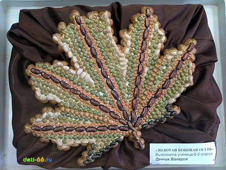 Работа выполнялась на Осеннюю ярмарку в школу из различных видов бобовых: горох, фасоль нескольких видов, чечевица. Им компанию составили скорлупа от фисташек, а общий золотистый тон дала бронзовая акриловая краска. Основание – пенопласт. Контур был вырезан с натурального кленового листочка.