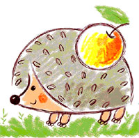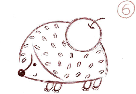 Шаг 6. Нарисуем на спинке то, что несёт наш ёжик (яблоко, гриб, портфель, будильник). Спинку украсим иголками.