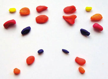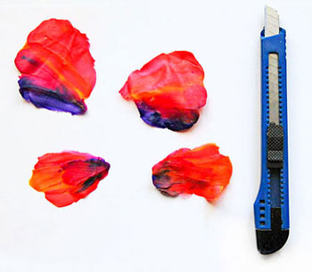 Подложим под прозрачную пластиковую доску (оргстекло) белый лист бумаги. Возьмем восковой флюоресцентный пластилин красного, оранжевого, лимонного, вишневого и фиолетового цветов.
