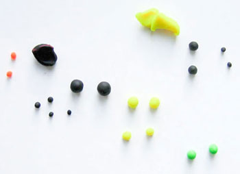 Для украшения крыльев раскатаем из черного пластилина шарики: два крупных, два средних и шесть маленьких – и такое же количество цветных шариков. Черные шарики служат основанием для цветных.