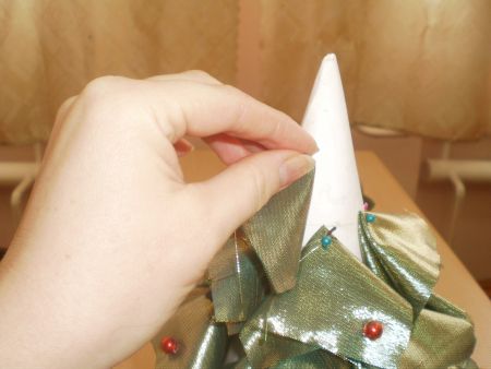 Четвертый шаг. Прикрепляем при помощи булавок треугольнички на конус. Прикрепляем макушку.