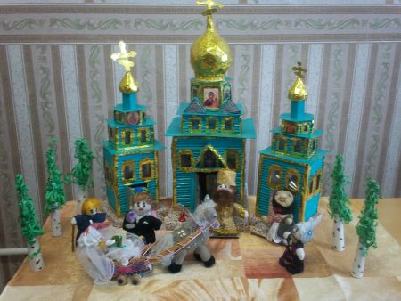 Очень мелкая фотография - кукол практически не видно. Церковь в принципе видна. Только непонятно почему в описании дается еще торговая лавка и воскресная школа, если на всех трех зданиях купола и кресты? Нет технологии изготовления. Объективно оценить работу невозможно, хотя задумка хорошая.