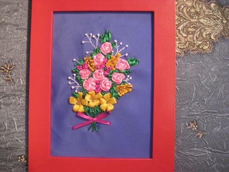 3. Вышить розочки ; роза-паутинка; материал: розовая лента, игла, нитки.