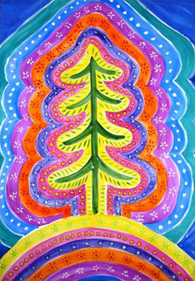 Рисуем ёлкин «скелетик» и, самостоятельно выбирая цвета, обводим его. Когда краска высохнет, можно добавить различные декоративные элементы. Получилась радужная зимняя ёлочка, словно сказочный ковёр!