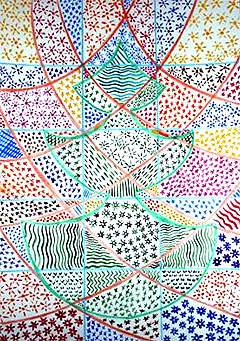 Разметим лист как в предыдущем случае. Плоскости заполняем разнообразным узором, самостоятельно выбирая цвета. Получилось новогоднее лоскутное одеяло!