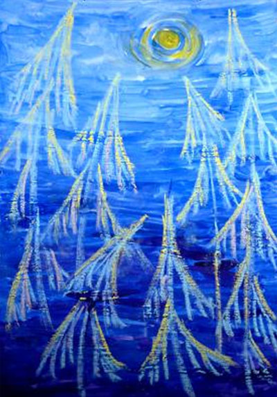 Смело закрашиваем лист всеми оттенками синего цвета. Мазки кладём горизонтально, имитируя низкие облака, снежные порывы ветра. Луну можно нарисовать жёлтой краской или позже мелом.