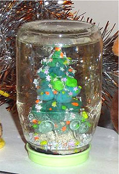Теперь можно в баночку налить воду, высыпать блёстки и плотно завинтить крышечку (ёлкой вниз). Потрясите содержимым и переверните баночку крышечкой вниз. Вихрем блёстки-снежинки закружатся вокруг Вашей замечательной маленькой красавицы!