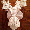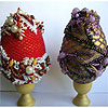 Пасхальная композиция состоит из двух пасхальных яиц, выполненных в технике сетчатого плетения, по сетке сделана вышивка листочками, бусинами и бисером.