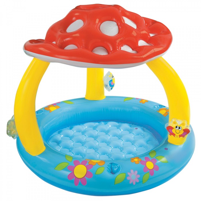 Бассейны, предусматривающие навесные конструкции. Является отличным вариантом для маленьких детей, так как позволяет защитить их головку от палящего солнца. Устройство имеет одно кольцо, козырек и дно, которое надувается. Изделие предназначено для сидячих игр, но не для плавания.