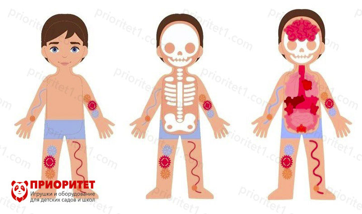 Для игр интереснее использовать бизиборд, например, вот такой бизиборд «Строение тела». Он представляет собой силуэт человека с отдельными органами, которые можно вставлять или прикреплять на своё место. Ребёнок учится определять, где находятся сердце, почки, лёгкие, желудок и другие органы. Вот несколько вариантов игр:
