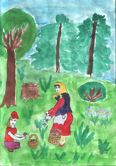 Однажды летом, рано утром, мы с бабушкой пошли в лес за грибами. Накануне прошёл дождь, высыпало много грибов. Мы быстро наполнили корзины, сели на пенёк отдохнуть. Бабушка налила мне в кружку молока и дала ломоть чёрного хлеба – до чего же он был вкусным здесь, в лесу! Кругом было тихо, лишь изредка раздавались голоса птиц.
