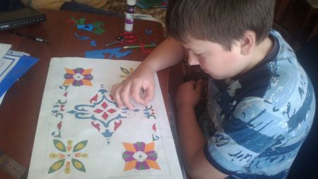 Работа выполнена в формате А-3, из маленьких кусочков цветной бумаги (мозаика). Геометрическая мозаика для ковра из селения Табасаран. Основа для узора выбрана растительная. Симметричность узора придает элегантность для будущего ковра. Работа была выполнена в 2011 году.