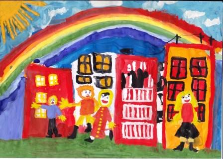 Семён, в твоем дворе действительно весело, и радуга у тебя получилась очень весёлая. Наверное ей передалось настроение вашей шумной, радостной компании. Оставайся и дальше таким же веселым и добрым мальчиком, удачи тебе Семён. Конечно же удачи и твоему другу Артёму и вашему педагогу Елене Ивановне!