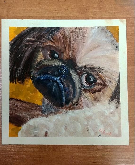 Автор работы изобразила свою любимую собачку пекинеса – Феню. Рисунок гуашью на грунтованном картоне сухой жесткой кистью. Размер работы 25х25 см.