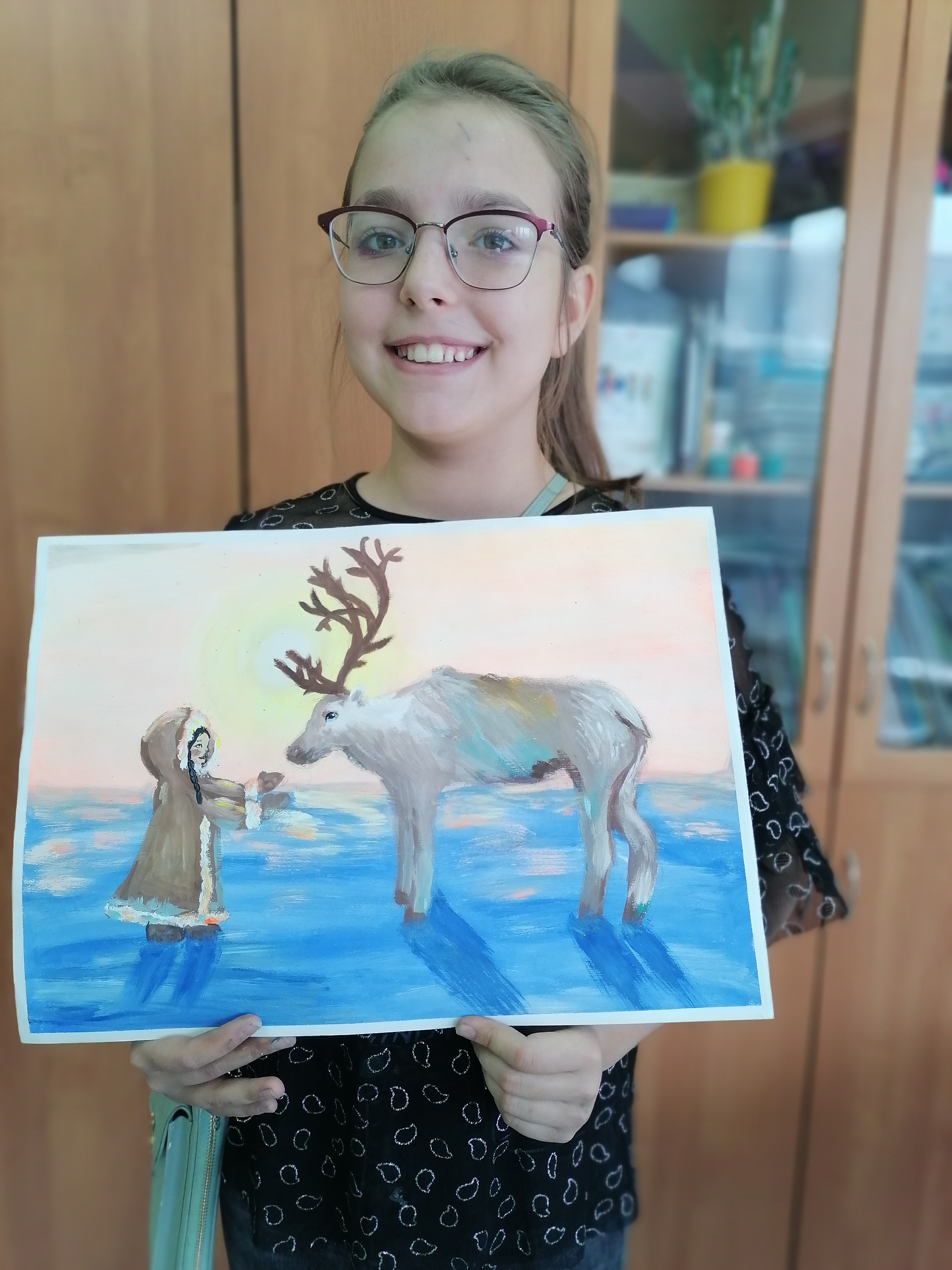 Своей работой Настя хотела показать, что наша планета Земля прекрасна в любой точке мира. Удалось передать скупую и холодную красоту Севера. Свет солнца бликует на снегу, одежде и олене.