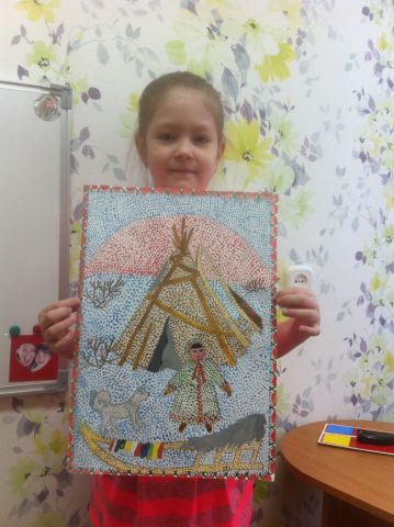 Риточка,ты очень замечательно изобразила зимний пейзаж тундры c помощью ватных палочек. Такая красивая весна у тебя получилась!Продумана рамка рисунка в виде орнамента, подобран колорит рисунка в целом. Желаю тебе успехов в конкурсе!