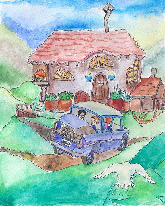 Многочисленные книги про Гарри Поттера привлекают юных читателей. Вика Кокорева любит не только перечитывать приключенческую фантастику, но и иллюстрировать эпизоды любимой книги. Один из решающих моментов книги «Гарри Поттер и Тайная комната» — визит к Рону на летающей машине.