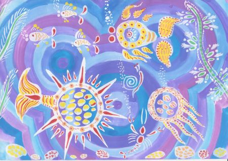 Надюша, твой подводный мир просто зачаровывает! Так захотелось стать рыбкой и побывать на дне морском, среди разнообразия твоих морских жителей. Рисунок очень живой, радостный. Молодец! Успехов!!!