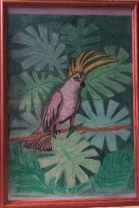 Я хотела передать его игривое настроение, как будто попугай что-то хочет мне сказать. В моей комнате стоит цветок с большими листьями и я представила, что такие же растения есть в джунглях, где живет мой попугай. Мы с мамой поставили работу в рамку и подарили руководителю нашей ИЗО студии Морозовой Людмиле Анатольевне. Так как на ИЗО студии мы знакомимся с техникой рисования гуашью и еще не рисуем пастелью, я не знакома с разными техниками рисования пастелью и рисовала как умела.