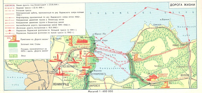 Дорога жизни включала сухопутный участок по железной дороге от Финляндского вокзала с выходом к берегу Ладожского озера, где были построены пирсы. В теплое время года, пока речка не замерзла, провизию, боеприпасы переправляли по реке накораблях. По дороге жизни не только доставлялась провизия, боеприпасы, благодаря ей были эвакуированы тысячи людей из оккупированного города на Большую землю.