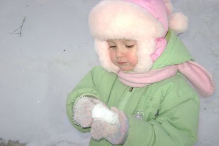 Это – Машенька. Очень спокойная, смышленая и вдумчивая девочка. С каким интересом она рассматривает комочек снега!