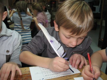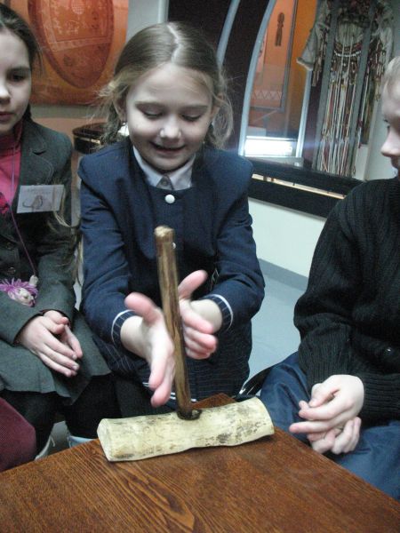 Самой интересной, на мой взгяд, оказалась экскурсия «В старой школе». Ребят усадили за деревянные столы и лавки около печки и ведра с розгами. Показали старинные книги и коллекции, дали возможность пописать гусиными перьями. Восторг был не только у родителей, но и у мам и бабушек, которые нас сопровождали.