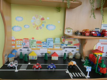 При организции деятельности с детьми большую эффективность имеют сюжетно-ролевые игры, поэтому мы включили в содержание нашего центра различные атрибуты для сюжетно-ролевых игр «Автобус», «Такси» и ряд других (рули, жилеты, шапочки с изображением различного транспорта и др.), а также создали напольное полотно, имитирующее проезжую часть с указанием пешеходного перехода и светофором.