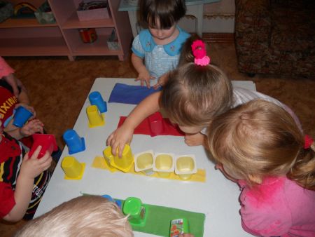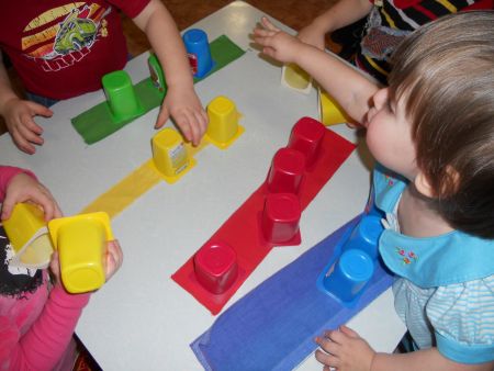 Замечательная работа. Увлечённые детки. Работу со стаканчиками возьму на занятие с некоторыми моими надомниками. Мы делаем похожую работу с крышечками от соков, складываем их в цветные ведерочки. Вам 5.