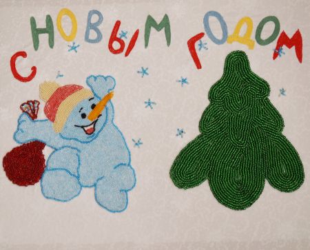 Один из этих сюжетов был придуман мною. Это новогодняя композиция «Веселый снеговик». Она состоит из снеговика и новогодней елочки, вышитых бисером. Поздравительные слова: «С Новым годом» выполнены «стебельчатым» швом нитками мулине ярких цветов.