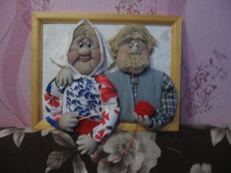 Куклы выполнены в скульптурно-текстильной технике, материал: проволочный каркас, синтипон, колготки. Первая кукла – шуточная миниатюра «Есть женщины в русских селеньях», вторая – барельефно-скульптурная кукла «Всю жизнь вместе».