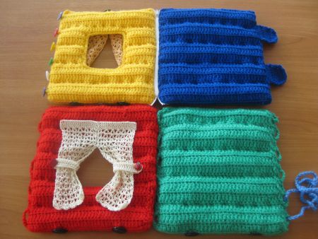 Пассажирами автомобильчика являются вязаные игрушки. Дома сделаны из коробочек из-под сока, которые тоже обвязаны крючком. Трава связана из пряжи «Травка».